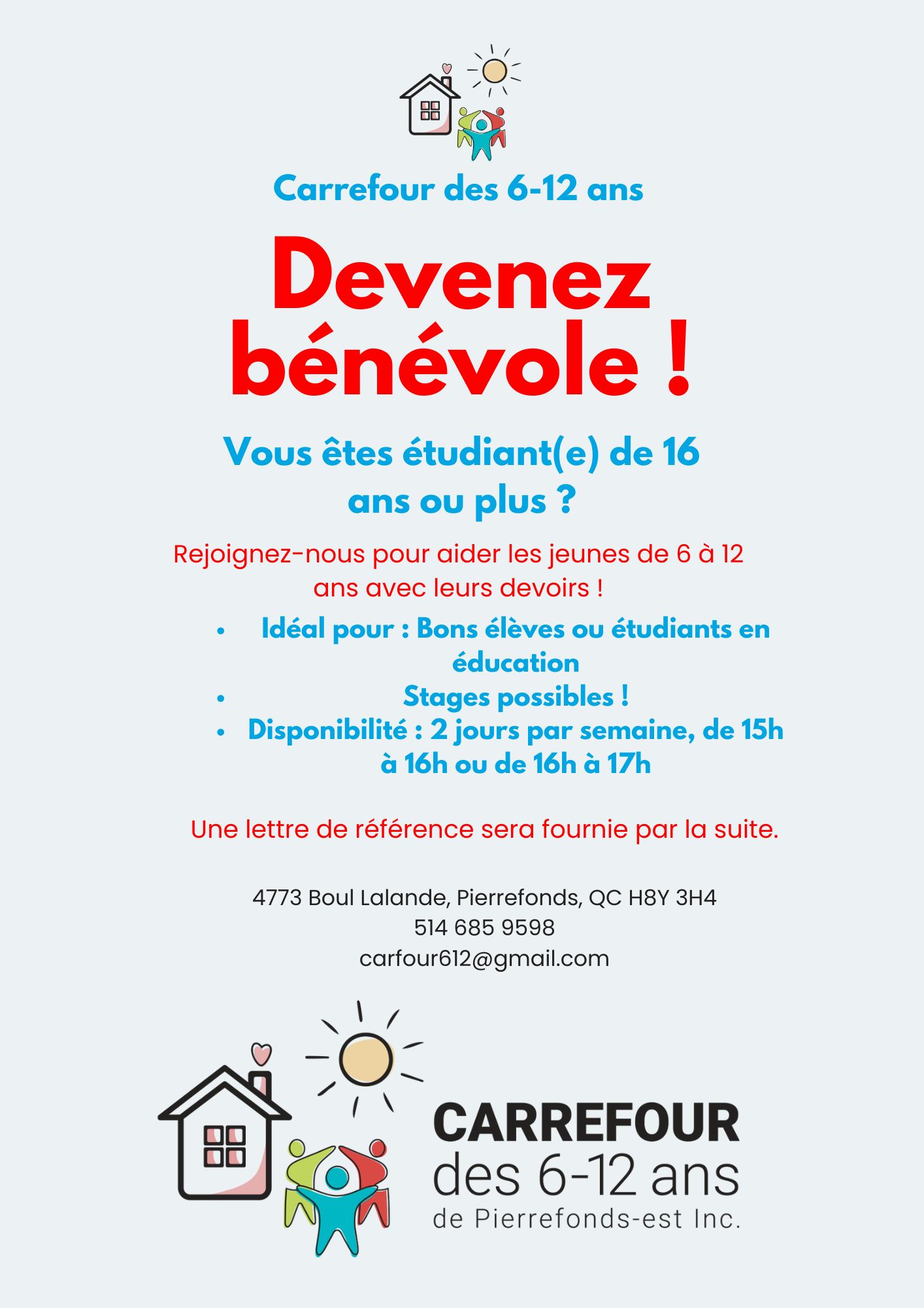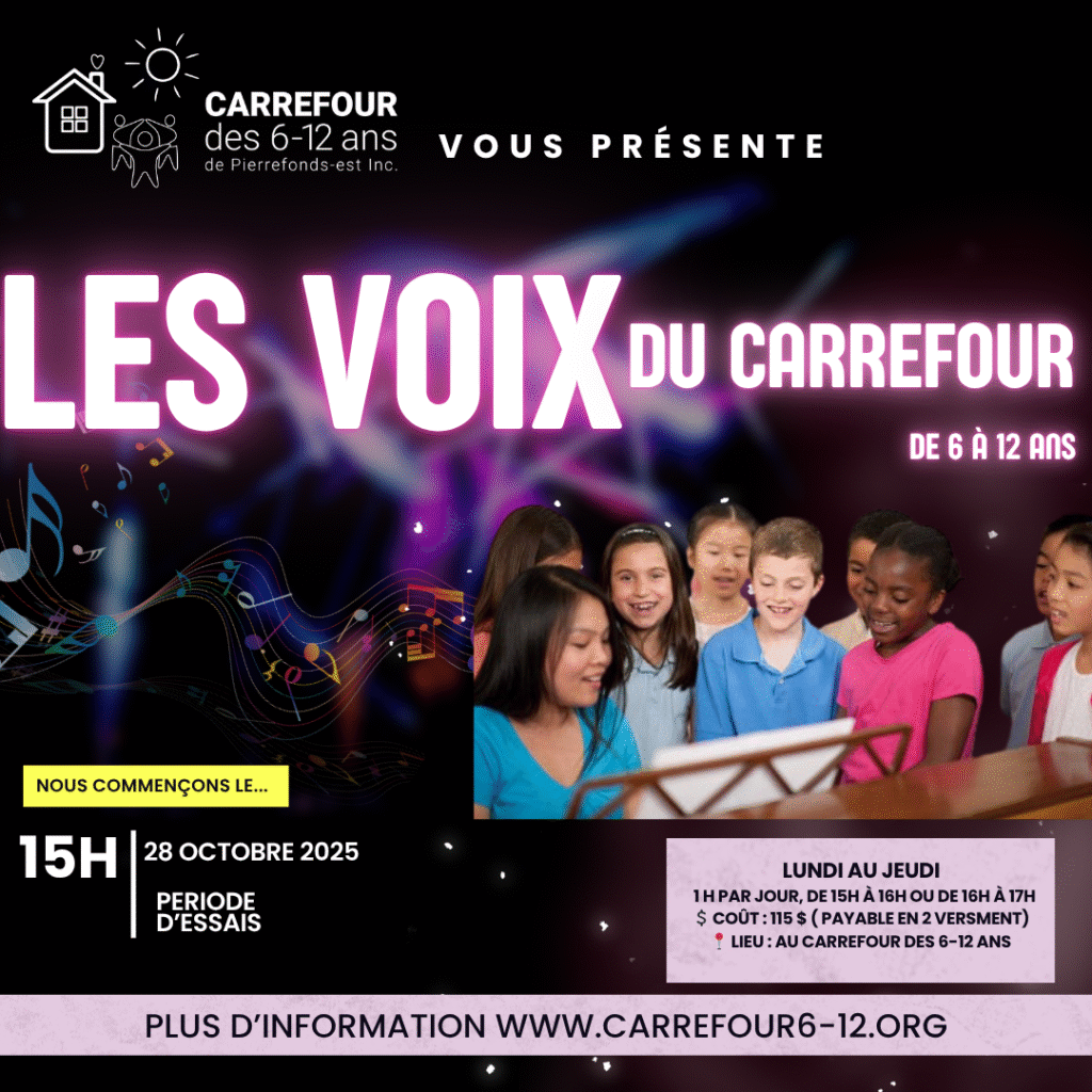 Découvrez Carrefour 6-12 : Nous nous engageons à soutenir le développement global des enfants vulnérables. Avec la collaboration des familles, nous offrons aux jeunes de 6 à 12 ans des activités enrichissantes, qu’elles soient socio-éducatives, sportives ou artistiques pour les aider à révéler tout leur potentiel.